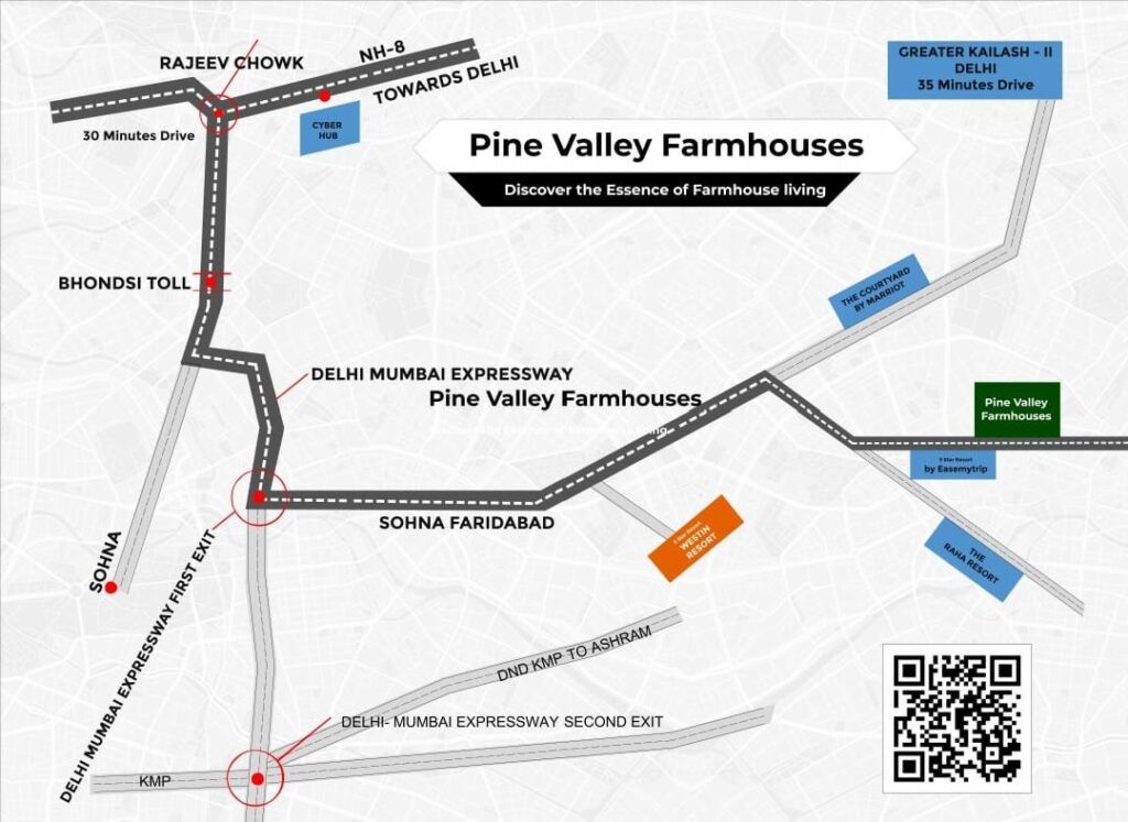 Pine Valley Farmhouses is a gated community of farmhouses located along the Sohna-Faridabad Expressway, offering a blend of luxury and tranquility. Spanning approximately 30 acres, this development provides spacious land options ideal for weekend getaways and private retreats.